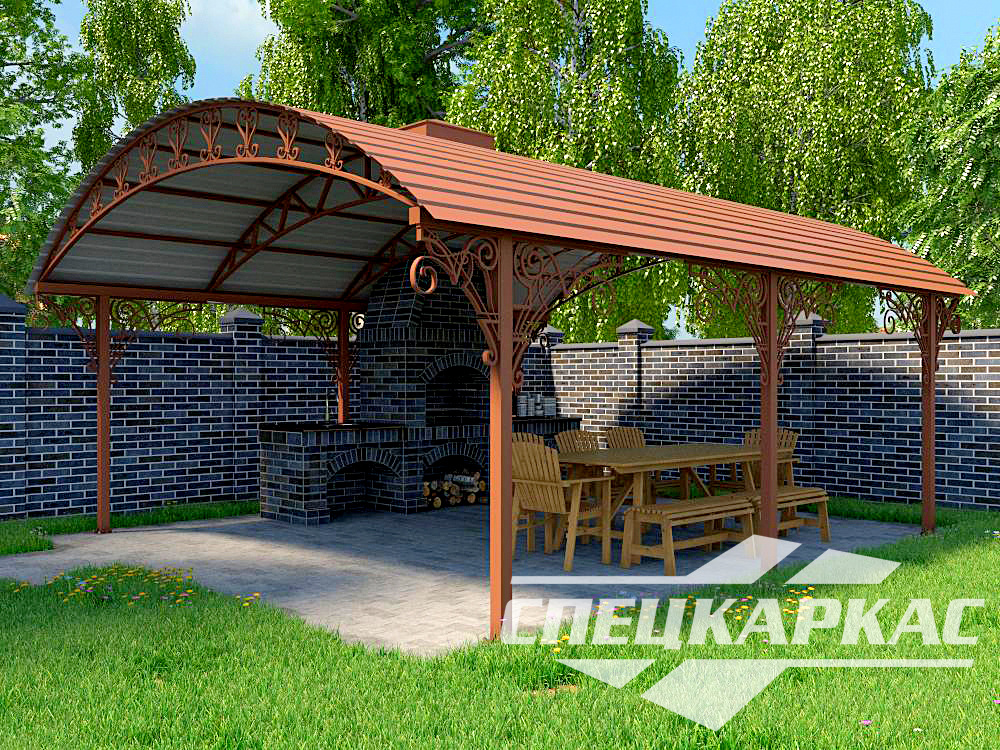 Компания «Спецкаркас» предлагает козырьки, беседки, навесы из поликарбоната любого типа и формата: одно- и двухскатные, прямые и наклонные, арочные и даже куполообразные.